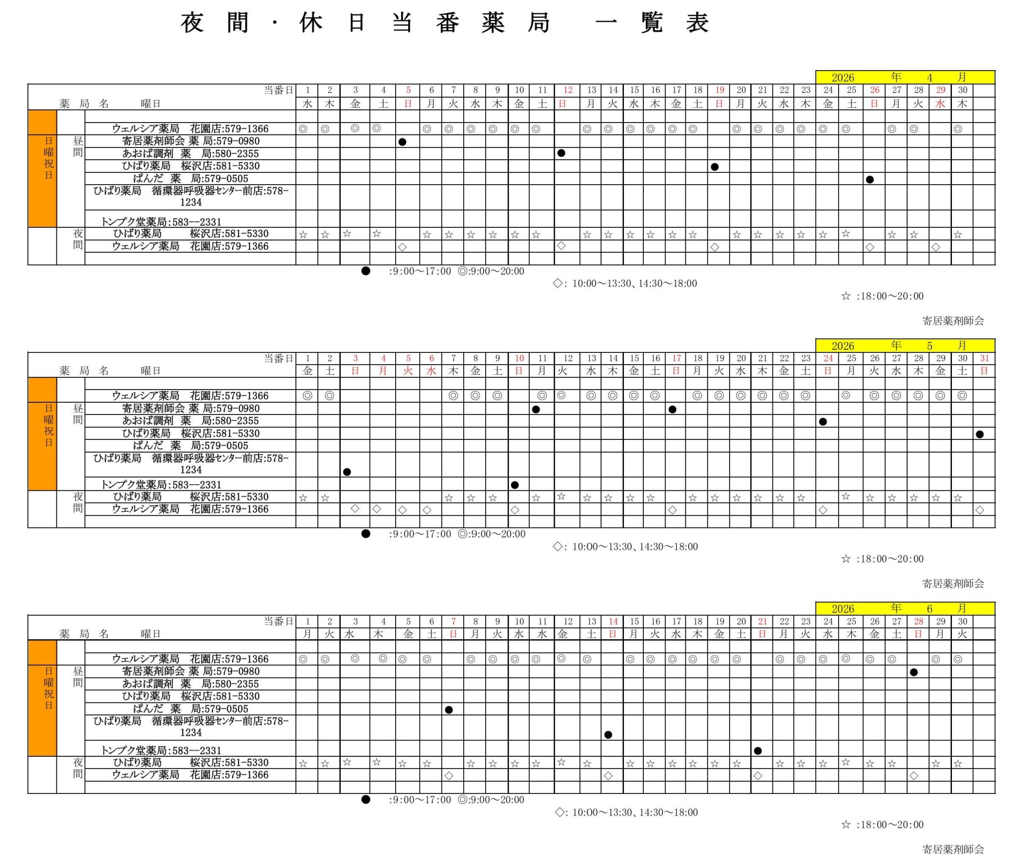 2026年4月~6月 夜間・休日当番薬局一覧表